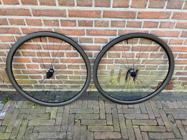 → 35 mm (voorvelg) en 35 mm (achtervelg) hoge U shape full carbon velgen afwerking UD mat